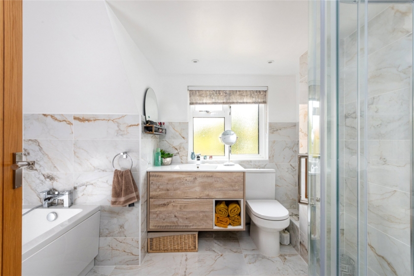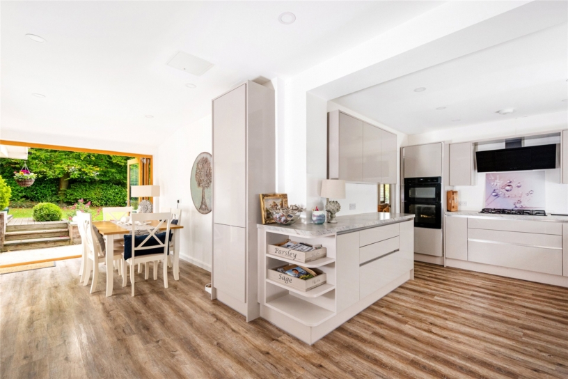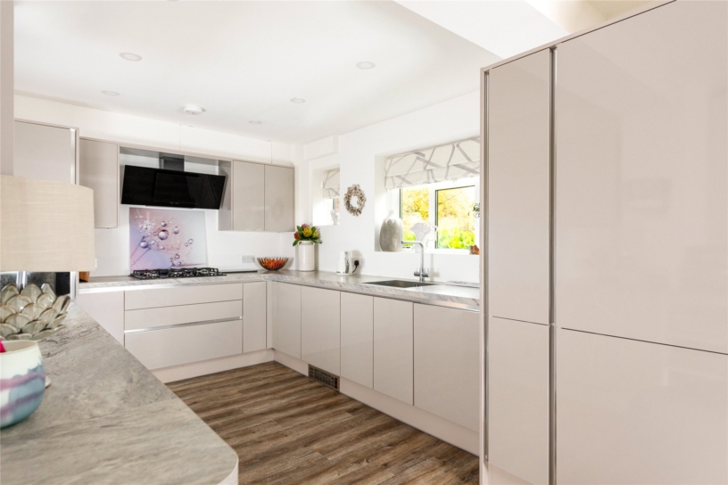 The kitchen/breakfast room is dual aspect and has a door to the front and bi-fold doors to the garden. The kitchen was refitted approximately 2 years ago and has handleless, contemporary cabinetry, LVT flooring and feature lighting. Integrated appliances include an integrated double oven, a gas hob with extractor above, a dishwasher, a full size fridge, and a full size freezer. The utility room is off the breakfast area and has matching cabinetry, a sink, space for a washing machine and tumble dryer, and a door to the patio.