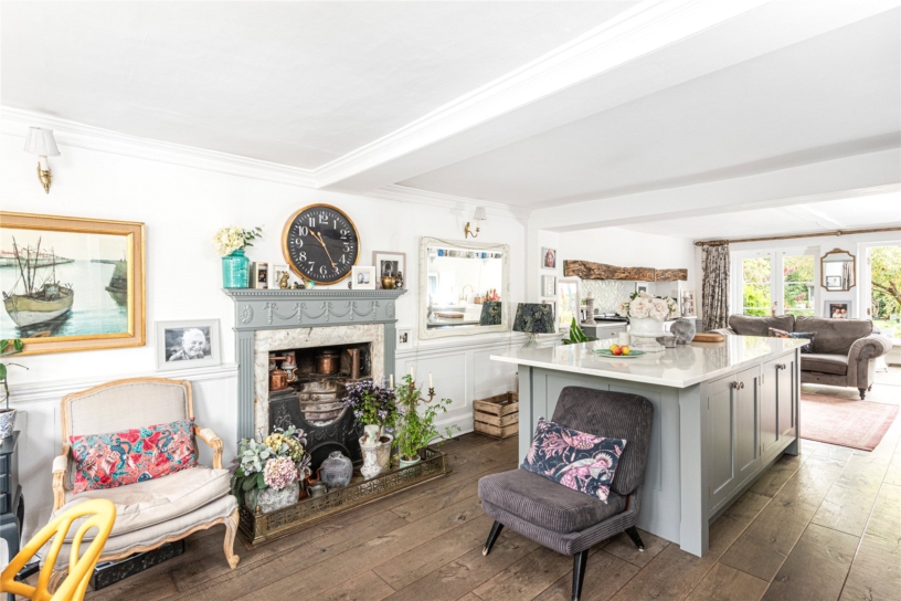 A real feature of the property is the open plan kitchen/dining/family room which was created by the vendors from an under utilised reception room. It has solid panelling to dado height and oak flooring throughout and is dual aspect with a wide bay window with a window seat overlooking the front garden, and two sets of newly installed French doors giving direct access to a terrace in the rear garden for al fresco dining and entertaining. There is a working open fireplace with a decorative surround and a cast iron grate in the dining area which has space for a dining table to seat six and soft seating by the fire. The chimneys in the property have all been recently swept. At the other end of the room there is space for additional soft seating by the French doors.