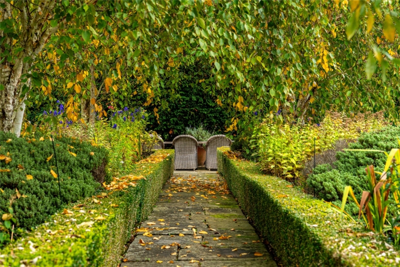 The terrace leads to a formal garden with lawns, shaped box hedges and established beds and herbaceous borders which have been planted with a variety of plants for year round interest including hydrangeas, salvias, roses, and lilac coloured wisterias. There is a raised paved area with a summerhouse, and a listed Yew tree which contains a tree house. Steps up from the formal garden lead to the rest of the plot which is a less formal meadow which has swathes of daffodils in the spring, blackberries and rhubarb, and a range of mature trees including an Ash and a walnut tree. There is a Victorian style greenhouse in the middle of the meadow which has a brick base, an internal water trough, and a mature grapevine. A second greenhouse and two timber sheds are also in the meadow area.