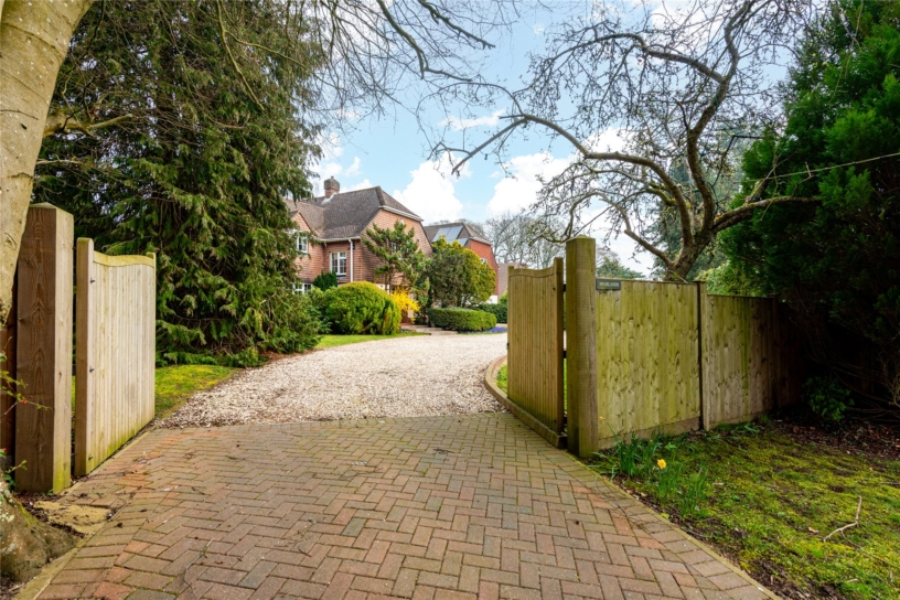 At the front, an area of herringbone block paving leads to the driveway via two double-doored, solid timber gates. The gravelled driveway which swings around the front of the house has an area of curved lawn on the side farthest from the house and is enclosed by clipped hedging, either established leylandii or laurel, screening the house from the road. Immediately in front of the house are borders planted with a variety of shrubs and there is a mature specimen fir tree on one side.