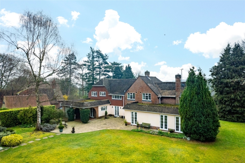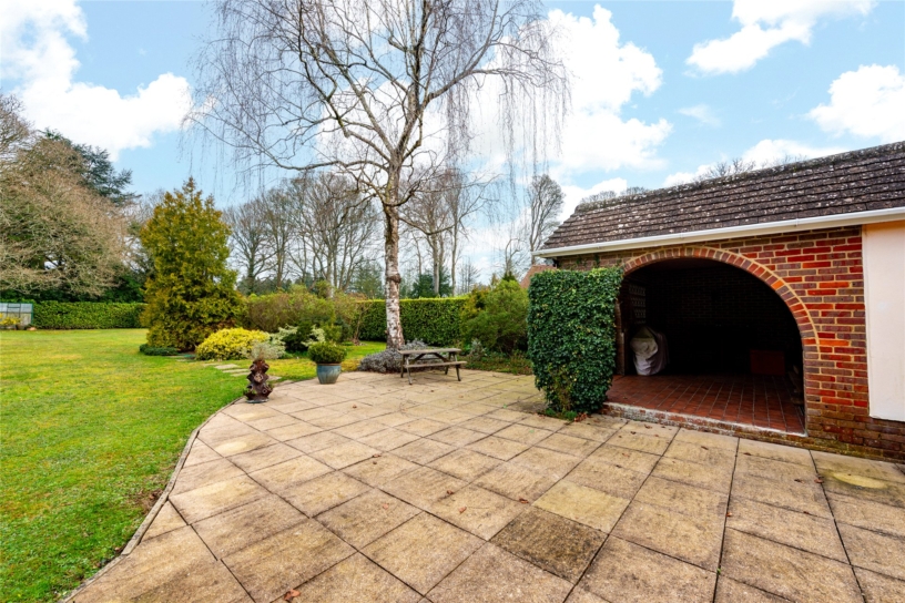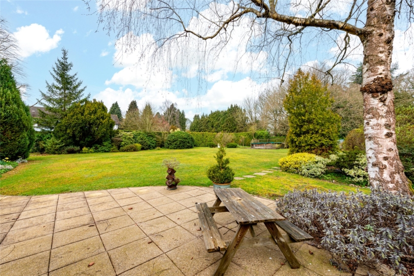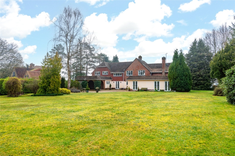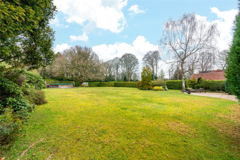 - ideal for children’s games or for a marquee; there was once a tennis court near the east boundary. There is an artificial pond with a built-in pump and filter, and a resident ‘troubling’ of goldfish. The wraparound garden has mature trees including a silver birch, providing dappled shade near the patio, and a mature oak which shelters the end of the garden. Large neighbouring gardens mean the main garden is not overlooked. The garage is currently used as a mower store and there is a greenhouse at the rear of the garden.