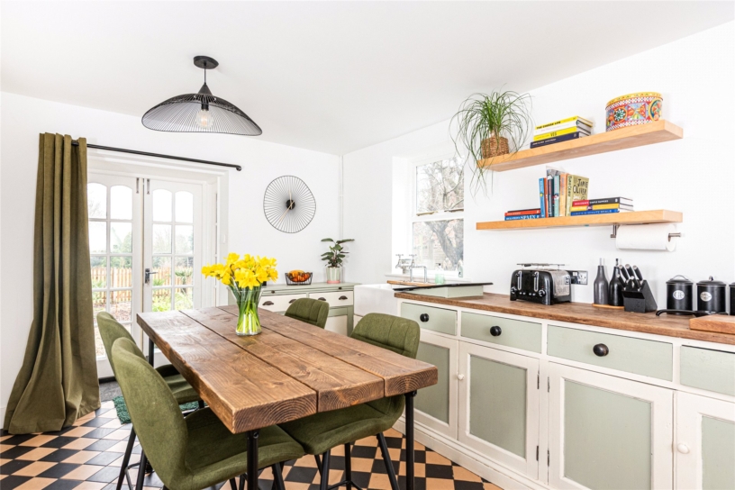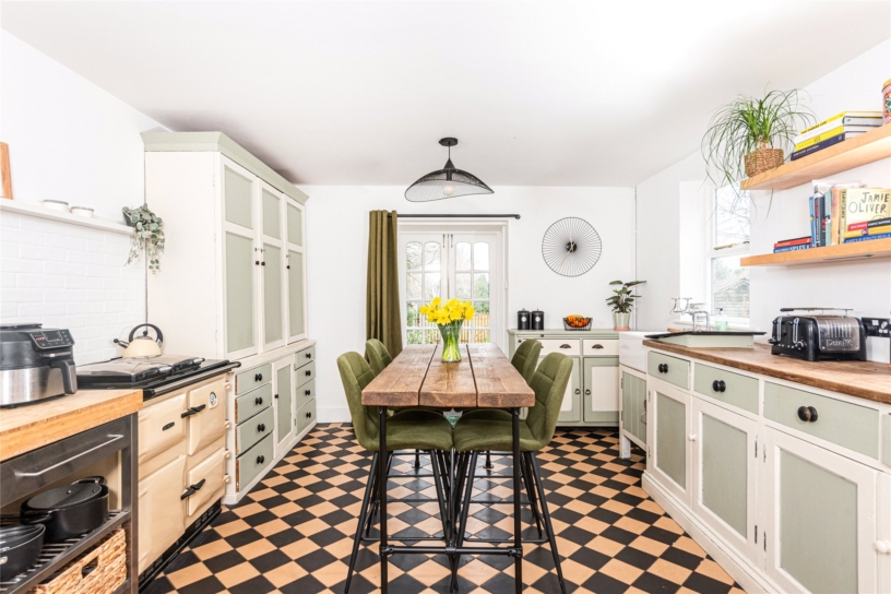 An extension was added in around 2020 and accommodates the dual aspect kitchen/breakfast room, extending to over 20 ft. in length. It has chequered floor tiles, a Rayburn range which also provides gas central heating, and a Belling range cooker with seven gas rings. There are farmhouse style free-standing painted cupboards and cabinetry with beech worktops and an inset butler’s sink. French doors in a box bay open to the rear garden. Off the kitchen is a separate utility area with a sink, an external side door, and access to a two piece cloakroom.