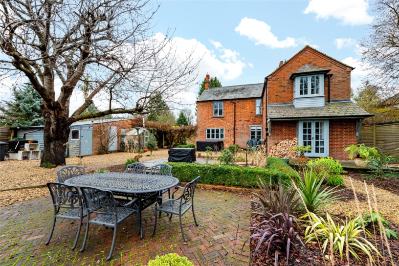 The property is set back at the end of a gravel driveway which leads to further parking ahead of a single garage and a connected brick store. The front garden is laid mainly to lawn with gated access to the side and rear gardens. The landscaped rear garden is a notable feature and has raised vegetable beds, an ornamental cherry tree, a productive pear tree, and a fig tree. There is an open outlook to the rear.
