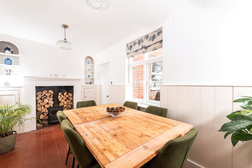 The brick under slate property was built in 1896 and offers over 2,200 sq. ft. of combined accommodation. The front door opens to an entrance porch with original encaustic mosaic tiles. Off the hall, is the over 21 ft. x 11 ft. triple aspect sitting room. This has oak herringbone parquet flooring, an in-built cupboard with shelving in the understairs space, and an open fire. Across the hall is a dual aspect TV/family room which has painted floorboards and a woodburning stove inset into the original brick fireplace. Both rooms lead to the quarry tiled dining room which overlooks the rear garden and has a woodburning stove under a period mantel, panelling, and flanking, arched shelved alcoves. The kitchen/breakfast room is off the dining room and leads to a separate utility room and a cloakroom. The house retains many original features including high ceilings, sash windows, deep skirting boards, and original door treads. The whole property has been recently repainted.