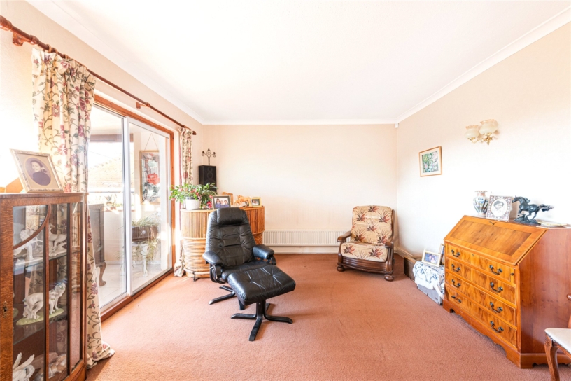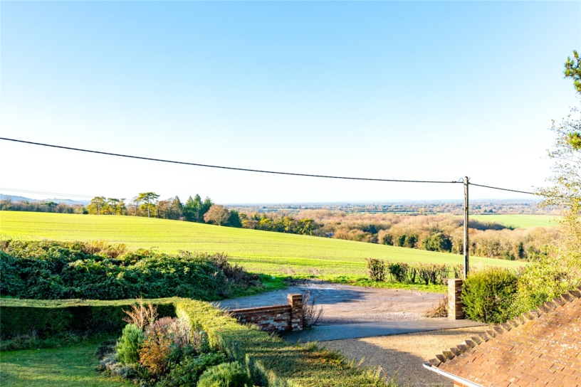 A 1920s detached single storey residence with over 0.5 acres of land, outbuildings, and views over Aylesbury Vale. The house has over 1,473 sq. ft. of accommodation arranged over two floors and is set on a cul-de-sac with ample driveway parking. The front door leads into the reception hall which is fully glazed at the front to make the most of the landscape it overlooks. Two sets of patio doors offer access to the sitting room which measures over 28 ft. by 12 ft. with a brick-built and tiled open fireplace. An inner hallway leads to the open plan kitchen/dining room with a range of built-in units with worksurfaces and spaces for appliances as well as a breakfast bar. The dining area has ample space for a table and patio doors opening to the rear paved seating area. A utility room with another sink and a stable door to the side lies off the kitchen area. There are two bedrooms off the inner hallway and a shower/wet room. Stairs in the hallway lead up to the main, dual aspect bedroom.
