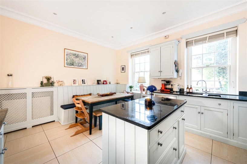 The kitchen/dining room is fitted with a range of handmade/hand painted units with granite worksurfaces, a built-in seating area with storage below, and an island unit with drawers and cupboards. Appliances include a Lacanche range cooker with five-ring gas hob and an extractor fan, an integrated dishwasher, and a fridge/freezer, and a Vaillant boiler which was replaced approximately 2 years ago. Additional features include a walk-in pantry, a butler’s sink with mixer tap, and a decorative radiator cover. Two sash windows overlook the driveway and village green beyond.