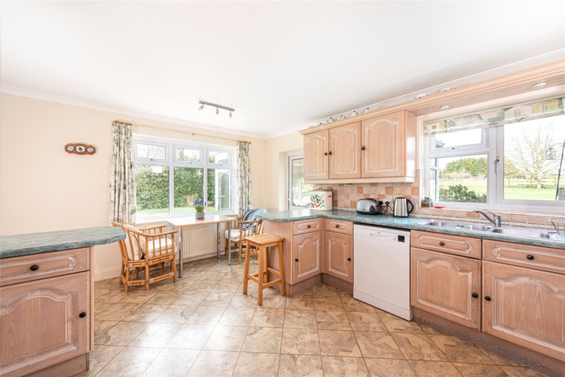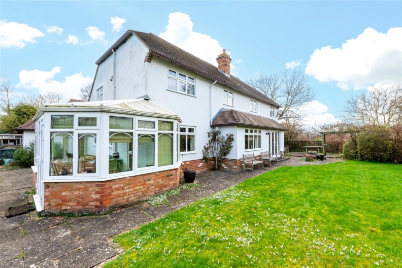 With far-reaching views over its own gardens and paddock land, this family home with three reception rooms is naturally well lit, with approximately 2,373 sq. ft. of versatile accommodation set over two floors, and scope for some updating. A covered porch opens to the entrance hall with nearby cloakroom and cloaks cupboard. The snug/study is at the front of the house with a box bay window and the 22 ft. by nearly 18 ft. L-shaped sitting room has an open brick fireplace and French doors to the rear patio and garden. The dining room has views over the garden and accesses the dual aspect kitchen/breakfast room with its limed oak style units with built-in appliances and space for a breakfast table. Doors open to the conservatory, with French doors to the garden and paddock views, and the adjacent utility room with further units, a sink, room for appliances, and an external stable door. Leading off the first floor landing are four double bedrooms and two bathrooms, one en suite.
