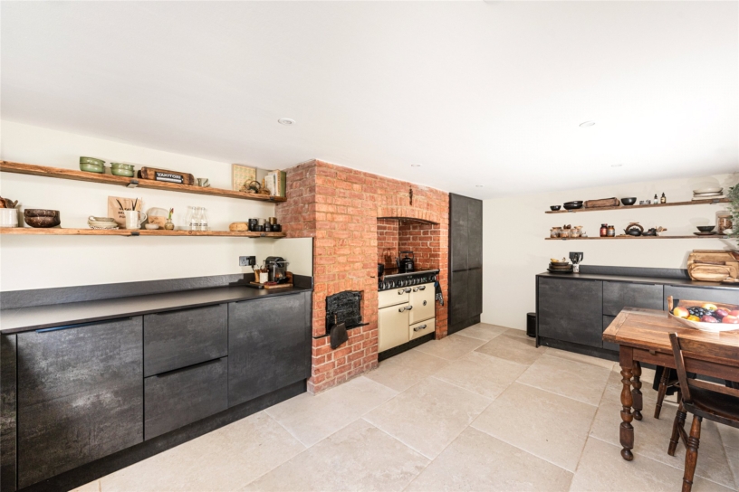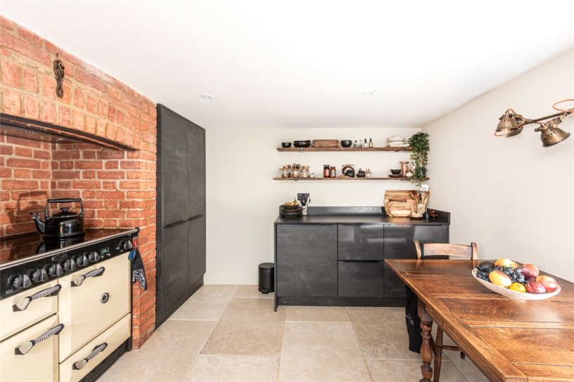 Contemporary German engineered Nobilia units have been recently fitted in the kitchen/breakfast room and a Rangemaster stove is inset in the brick fireplace, which retains its original bread oven. The floor is tiled in porcelain and has under floor heating and a window overlooks the garden. Integrated appliances include a Neff fridge and a Bosch dishwasher. There is space and plumbing for a washing machine, a tumble dryer and ample room for a breakfast table.