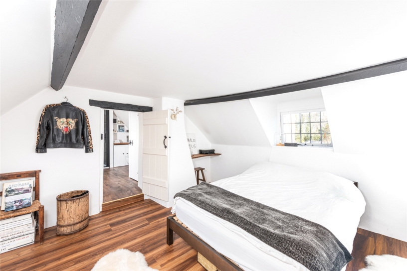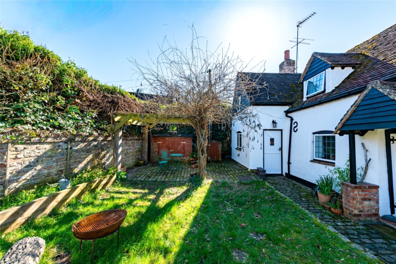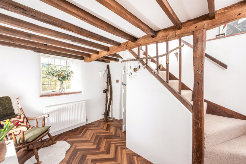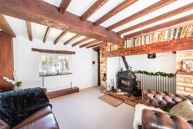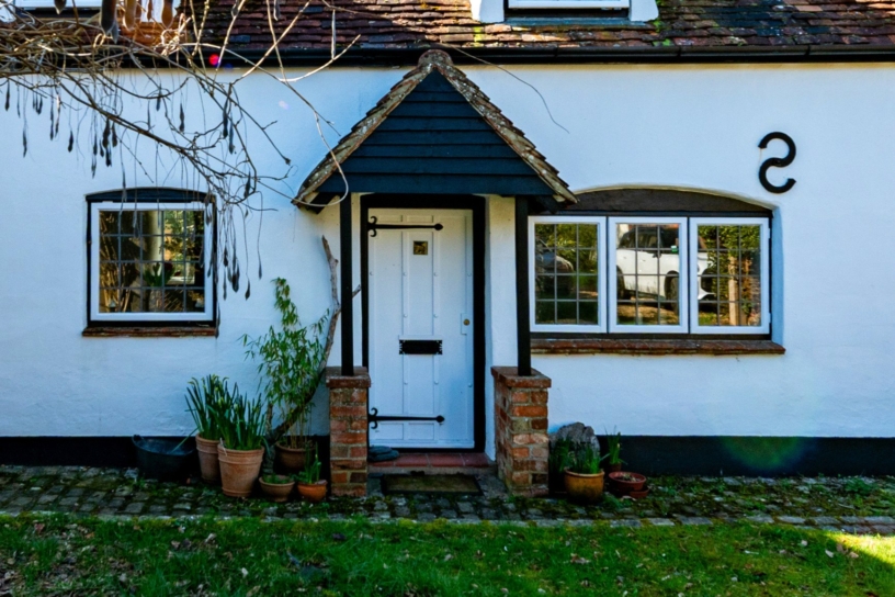 Timber framed, with rendered walls under clay, Clapgate has over 1,200 sq. ft. of accommodation over two floors. Situated in a conservation area with a network of footpaths, it shares a private driveway and has a gated front garden with a lawn and a walled courtyard. Carefully restored and updated, it retains many original features including a brick inglenook fireplace, with an insFroet wood burning stove in the sitting room. There are exposed walls and ceiling timbers and internal latch doors. A front stable door opens to the kitchen/breakfast room, which leads to a dual aspect study with engineered oak flooring and stairs to the first floor landing. There is a dining room with a casement window overlooking the front, the original wooden front door, and an exposed brick wall. This accesses the nearly 13 ft. by over 10 ft. sitting room with another casement window. Upstairs, are three vaulted bedrooms, some beamed, and one with an en suite shower room; there is a family bathroom.