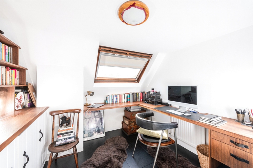 The principal bedroom is dual aspect and has engineered wood flooring. A step leads up to the modern en suite shower room where the low profile shower cubicle has a Crittall effect door and Italian tiling. There are two further bedrooms; one is currently set up as an office with bespoke British walnut shelving, cupboards, and a desk. There is also a three piece family bathroom.