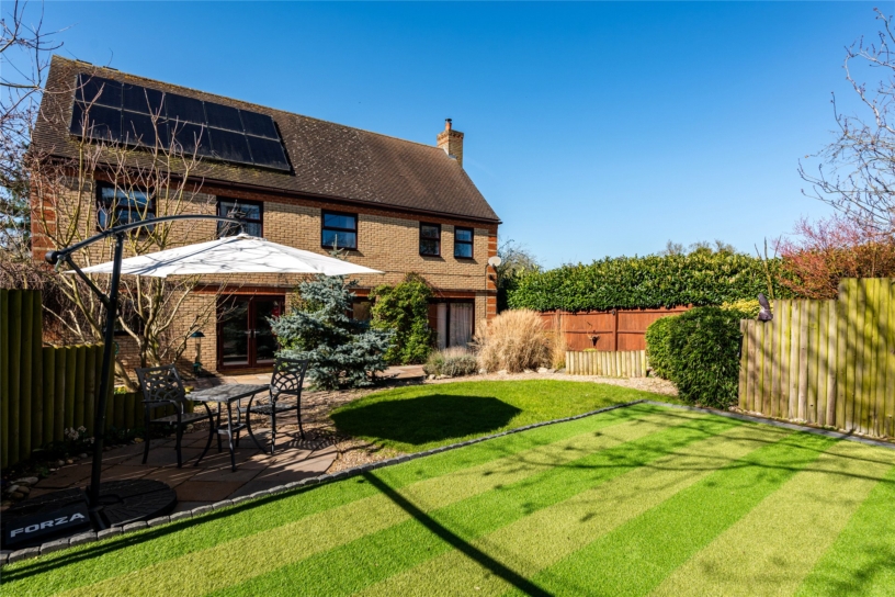 A five bedroom detached house with a double garage, gated driveway parking with an Electric Vehicle charge point, an enclosed rear garden, and solar panels.