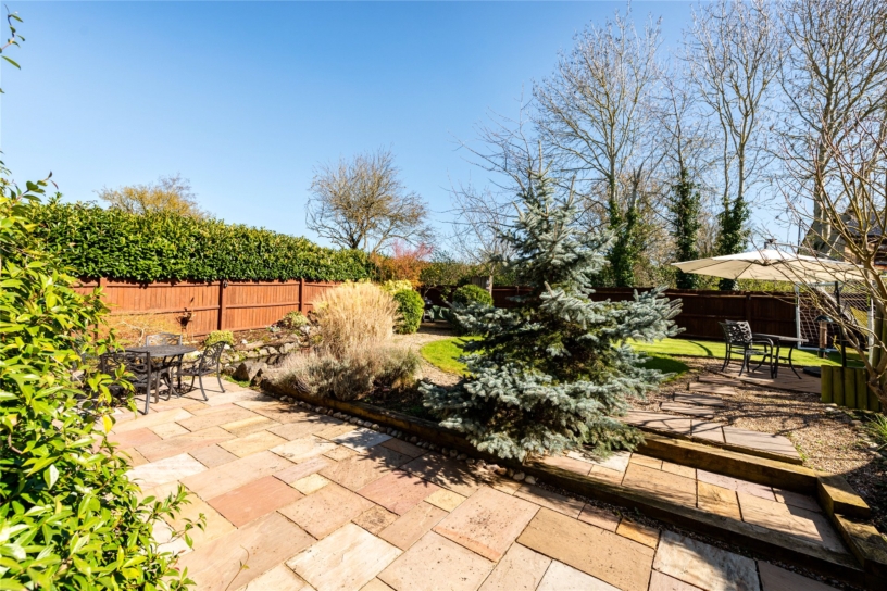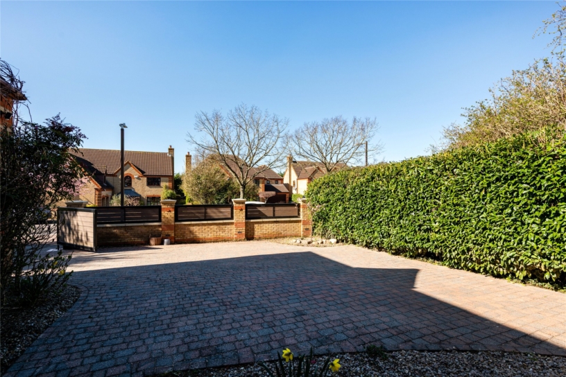 Electric gates lead to a block paved driveway with parking for several cars, and a double garage with electric roller doors, power and light, and an Electric Vehicle charge point. The rear garden is fully enclosed by fencing and screened by mature hedges and trees. The patio spans the rear of the property and has outside lighting, power, and a tap. Steps lead up to a lawned area and an additional paved and gravel seating area. There is a pond, raised flower beds and a shingled path to a barbecue area.