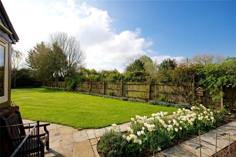 The private and established gardens wraparound the property. The rear garden is laid predominately to lawn and is bordered by mature trees and flower beds. There is a kitchen garden to one side of the property which has raised beds, and a variety of fruit trees including plum, cherry and pear. A path leads around to a terraced seating area which is accessed from the garden room. The path continues to a main terrace for outdoor dining and entertaining. This has a seating area with a pergola which has a retractable roof and retractable covers to two sides to provide shade and protection. There is also a further covered seating area adjoining the back of the house and further seating areas throughout the garden.
