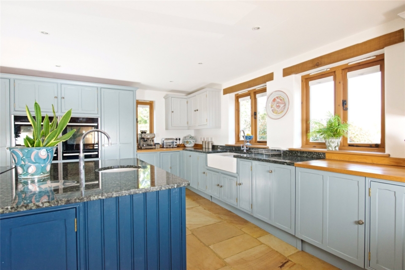 The sitting room is accessed from the entrance hall and has a dual aspect. There are French doors to a terrace in the rear garden. An exposed brick chimney breast has an inset woodburning stove. The formal dining room is accessed via double doors from both the sitting room and entrance hall. There is space for a table seating fourteen and French doors also lead to a terrace. A door leads to the study which has a triple aspect with windows to the front and to the side garden. Oak wood flooring runs throughout these three reception rooms. The garden room is accessed from the kitchen/breakfast/family room. It has a triple aspect and French doors to a terrace. There is also an air conditioning unit that heats as well as cools. There is a trapdoor in the floor which opens to stairs down to the wine cellar which has built-in shelving.