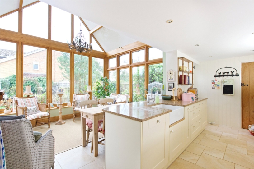 The oak framed extension has a glazed gable with French doors leading to the garden and creates an open plan dining/family area leading off the kitchen which has a range of base units with granite and oak work surfaces, Belfast sink, Rangemaster dual fuel cooker and an integrated dishwasher and fridge freezer.