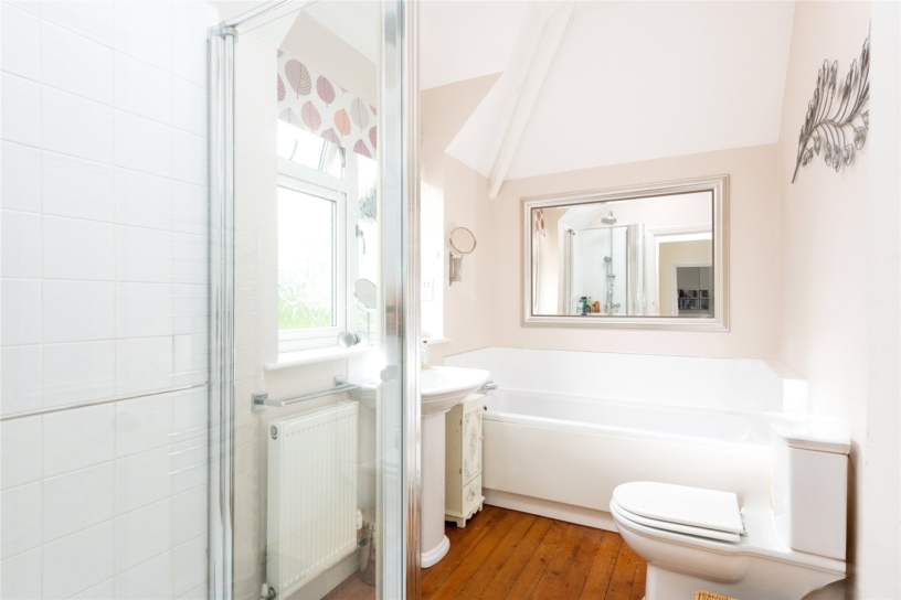 Two staircases lead to separate landing areas which access the five bedrooms The whole of the first floor has exposed floorboards and the four double bedrooms have feature open fireplaces; the fifth bedroom is a single room. The main bathroom has a freestanding bath and a shower cubicle.
