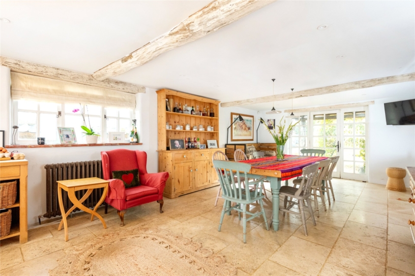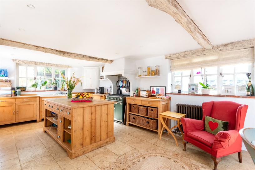 The vaulted, full height dual aspect sitting room has exposed stonework and roof trusses; French doors access the front and rear and there is a wood burning stove. An open plan play room/study comes off the sitting room, overlooking the front garden. The kitchen/dining/family room has French doors to the rear courtyard, a Rangemaster cooker with an extractor fan above, space and plumbing for a dishwasher and room for a dining table and a sitting area.