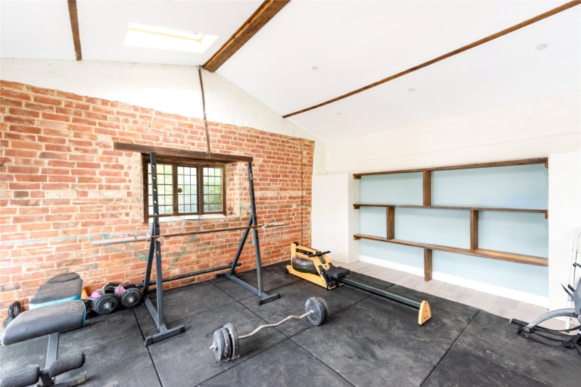 The outbuilding has been converted to a vaulted office and gym/games room, with electric underfloor heating and storage. There are lawned gardens to the front and a courtyard to the rear with raised planters and a patio seating area. The paddock extends to 0.4 acres, accessed by both the field gate and a hand gate from the front garden.