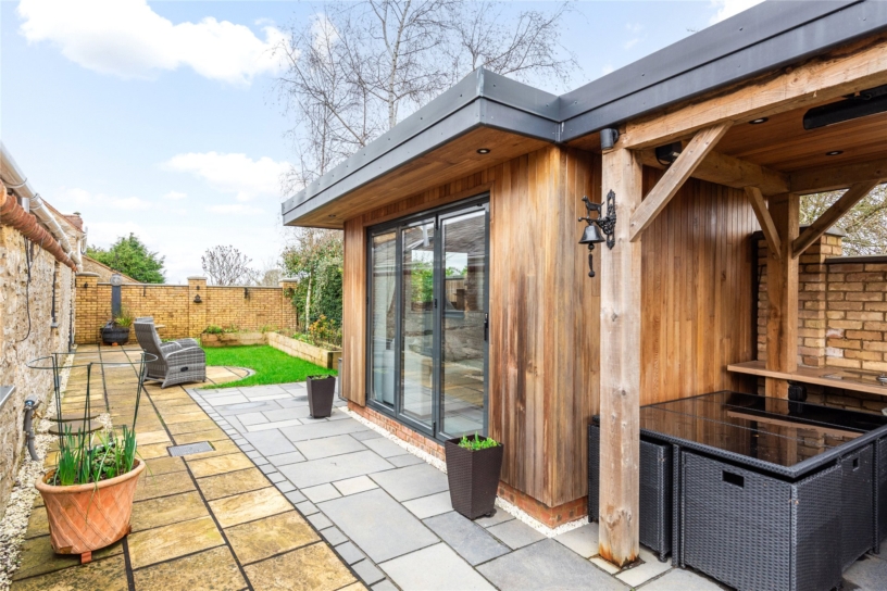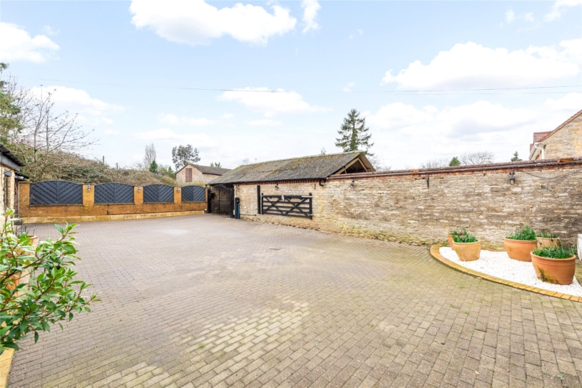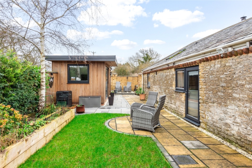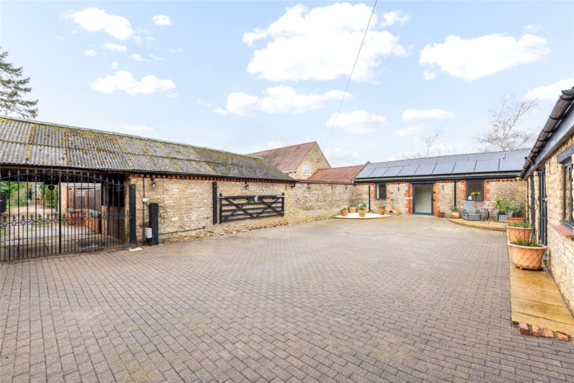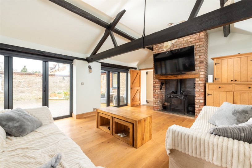 A stone built three bedroom link detached barn conversion with a detached garden room, a carport, and gated courtyard off street parking, in the village of Hartwell.