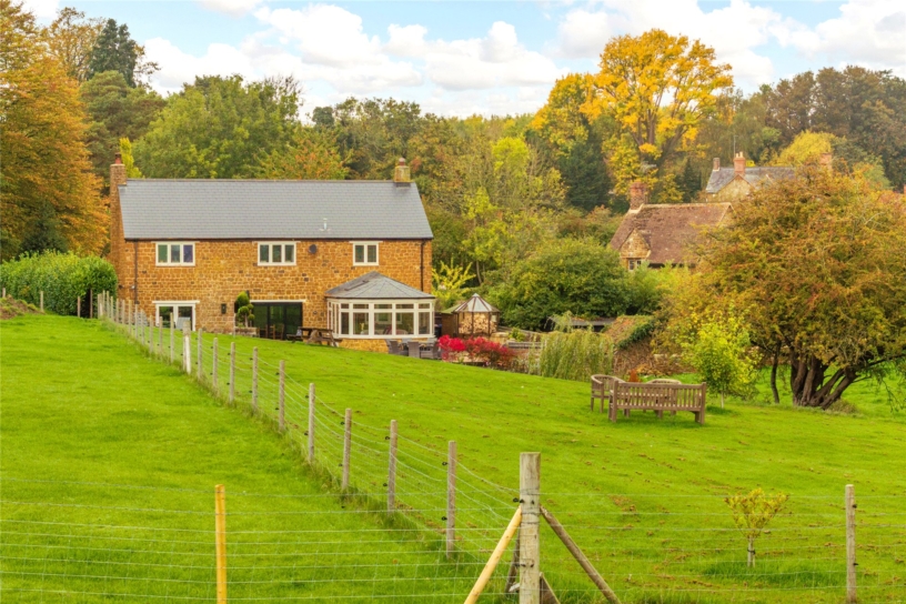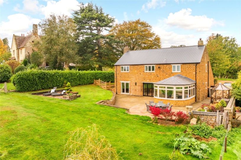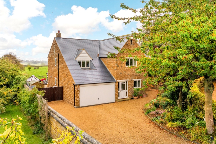A stone under slate four bedroom detached property with a double garage, driveway parking, wraparound gardens, and views over open countryside in a conservation area in Adstone.