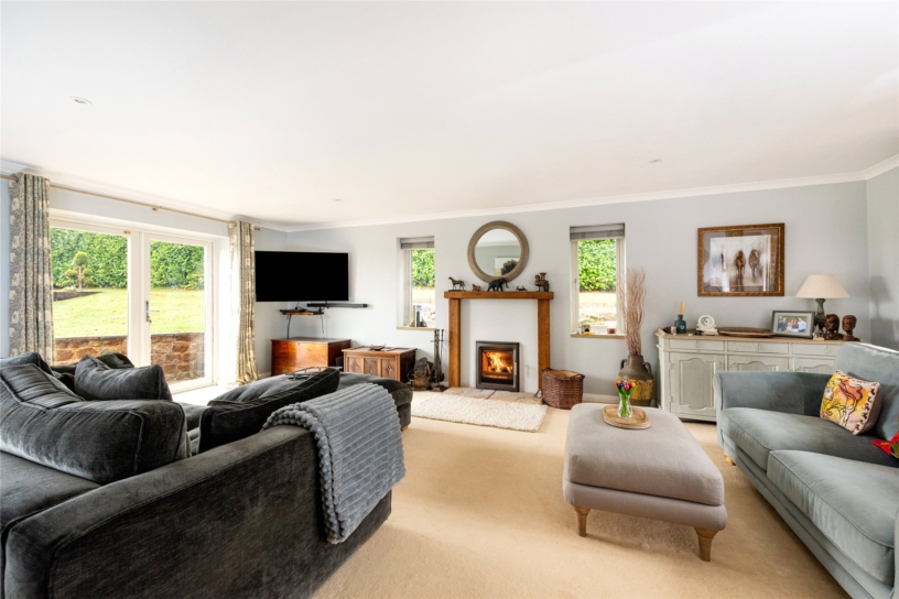 The sitting room has a multi fuel stove and French doors to the garden. The study is at the front of the property and the garden room is at the rear with windows overlooking the garden and French doors to a patio. It has a brick base and a replacement warm roof. The kitchen/dining room was formerly two rooms and has bi fold doors from the dining area to the patio. The kitchen has a freestanding dual fuel (bottled gas) Falcon range cooker with an extractor fan over, an under counter fridge, a separate full height fridge, and a built-in microwave. The adjoining utility room has space and plumbing for a washing machine and dishwasher.
