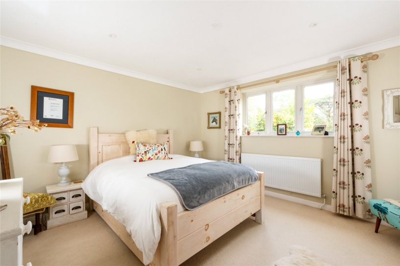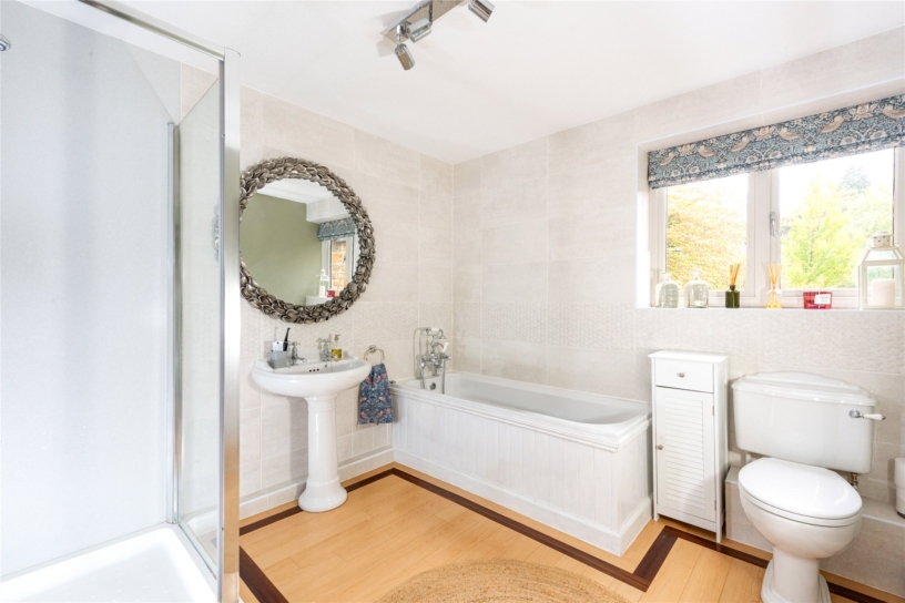 The galleried first floor landing has a walk-in shelved airing cupboard and access to four double bedrooms and the family bathroom. Bedroom one has a range of built in wardrobes, eaves storage and a three piece en suite with a double shower cubicle. a WC, and a wash basin set into vanity storage. Bedrooms two and three both overlook the garden and fields. Bedroom two has a two piece en suite with WC and wash basin and bedroom three has fitted wardrobes. Bedroom four overlooks the front. The main bathroom has a four piece suite with a separate bath and shower.