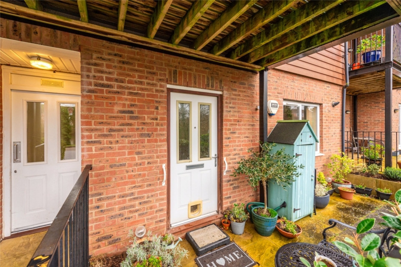 A modern two bedroom ground floor apartment with a paved terrace overlooking Parklands lake.