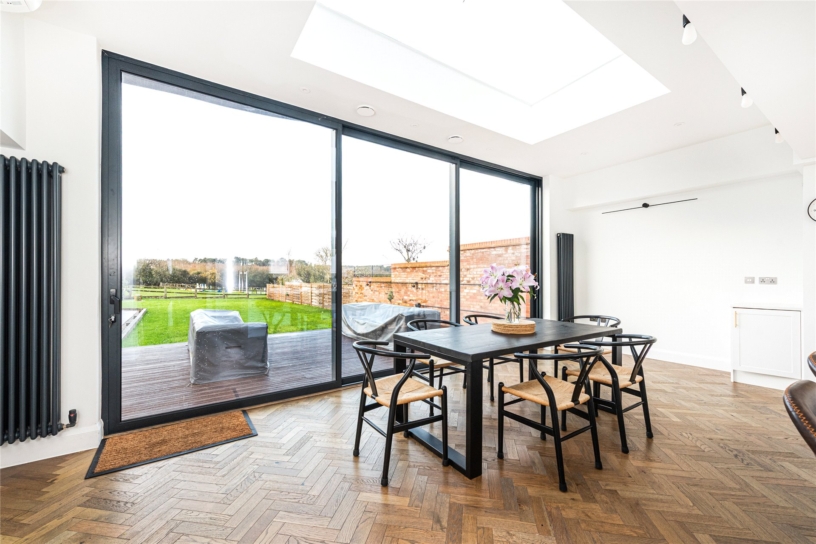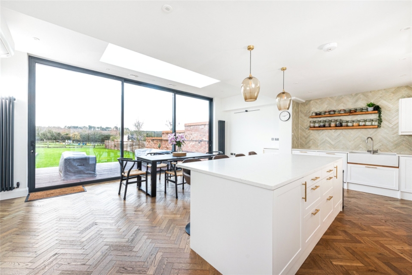 This extended and refurbished property has seven bedrooms, four bathrooms, three reception rooms, a conservatory and a kitchen arranged over three floors. There is a two bedroom annexe with a living space, bathroom and separate heating system. The front garden has parking for up to eight cars. The rear garden is laid to lawn with a decked patio entertaining area. A path along the side of the garden leads to a further seating area. Post and rail fencing separates the garden from paddocks and open countryside. Unfurnished. Available March 2026.