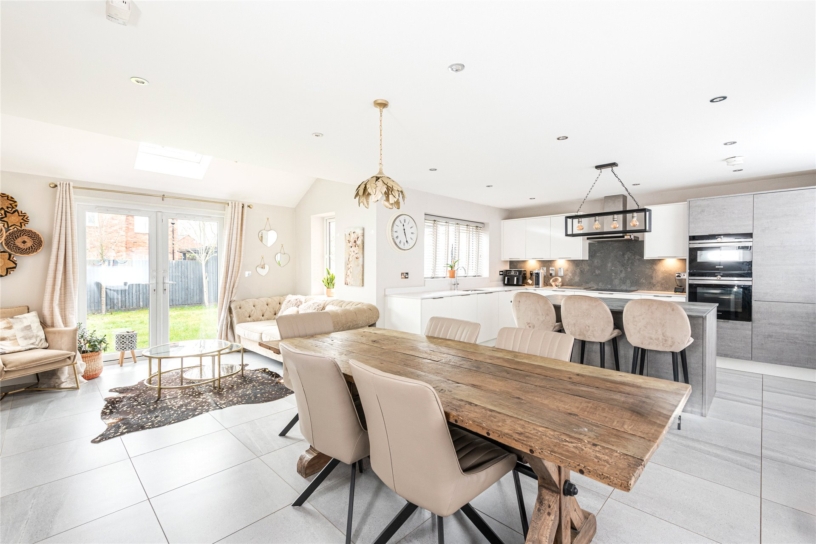 Built in 2019, the property has approximately 1,693 sq. ft. of accommodation over two floors. On the ground floor there is an entrance hall with stairs to the first floor, a built-in under stair cupboard and access to a cloakroom. The study has a window to the front and the sitting room has French doors to the garden and there is also a dining room which is open plan to the kitchen and family room. The kitchen has access to a utility room, which leads into the garage. On the first floor, the landing has access to an airing cupboard and the loft space. There are four double bedrooms; the principal bedroom and bedroom two each have an en suite shower room and there is also a family bathroom. At the front, there is a block paved driveway with parking for four cars in addition to the double garage which has power and light connected and a pedestrian door to the garden which can also be accessed via a gate at the side of the property.