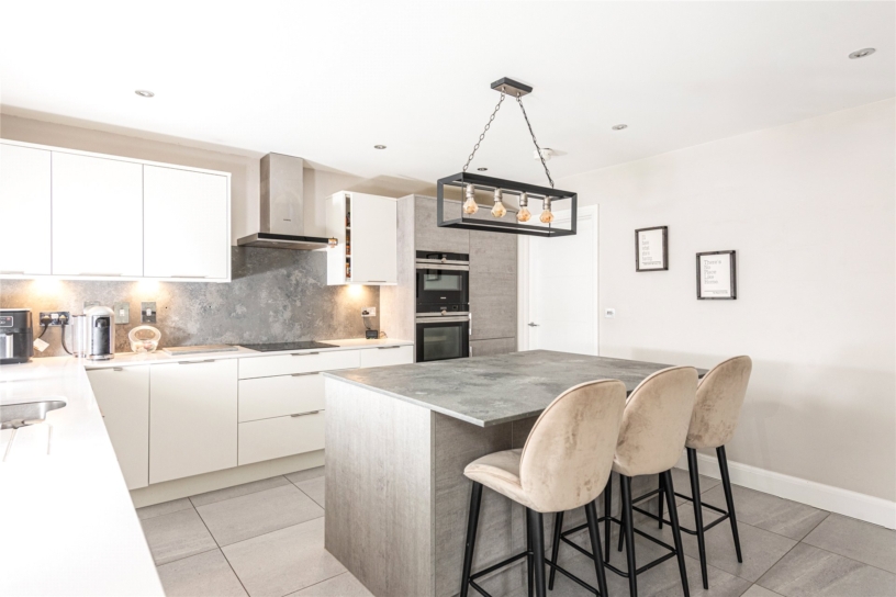 The kitchen/dining/family room is open plan with a tiled floor and double doors to the garden. The family area has a skylight window. The dining area has an open ended fireplace into the sitting room. The kitchen has a range of white fronted wall and base units, and a central island, with granite work surfaces and upstands and a stainless steel sink. Integrated appliances include an induction hob with an extractor over, twin electric ovens, a dishwasher and fridge/freezer. The utility room has a floor standing unit with a sink, and space under the work surface for a washing machine and dishwasher.